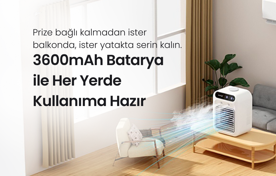 3600mAh yüksek kapasiteli bataryasıyla taşınabilir kullanım imkanı sunarken, buharlı ve buzlu soğutma özellikleriyle sıcak günlerde ferahlığı getirir. Hem nemlendirici hem de soğutucu olarak çok fonksiyonlu yapısı, evinizde, ofisinizde veya dış mekânda ideal bir ortam yaratmanıza yardımcı olur.