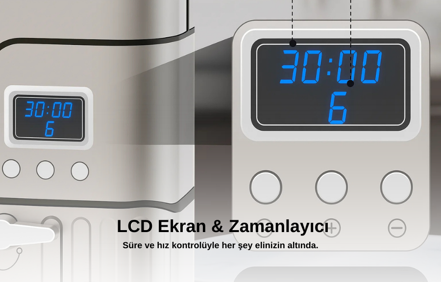 Kullanıcı dostu LCD ekranı ve dijital zamanlayıcısı sayesinde işlem süresini rahatlıkla kontrol edebilirsiniz. Zaman göstergesi ve hız seviyeleri ekranda net bir şekilde görünür. Böylece karışım sürecini başında beklemeden güvenle takip edebilirsiniz.