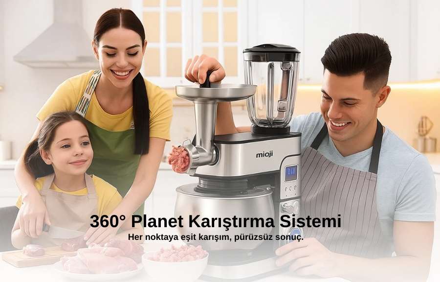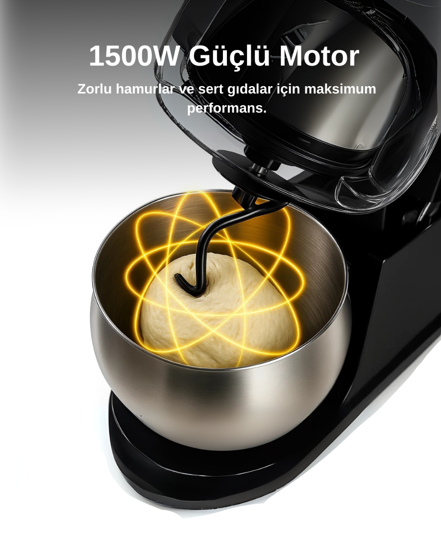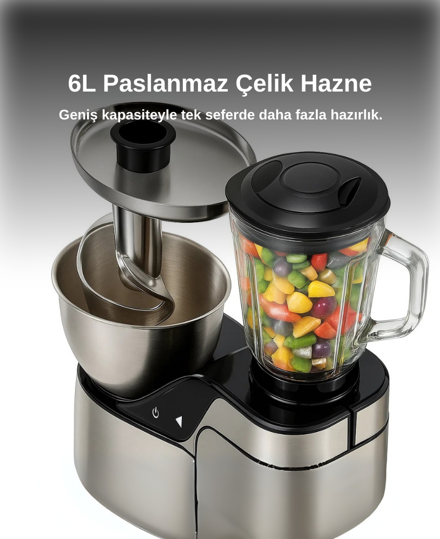 Güçlü 1500W motoru sayesinde sert gıdalarda bile üstün performans sunar. Hamur yoğururken zorlanmaz, kıyma çekerken hızlı sonuç verir, blender fonksiyonuyla en sert meyve ve sebzeleri kolayca parçalar. Profesyonel mutfak performansını evinize getirir.