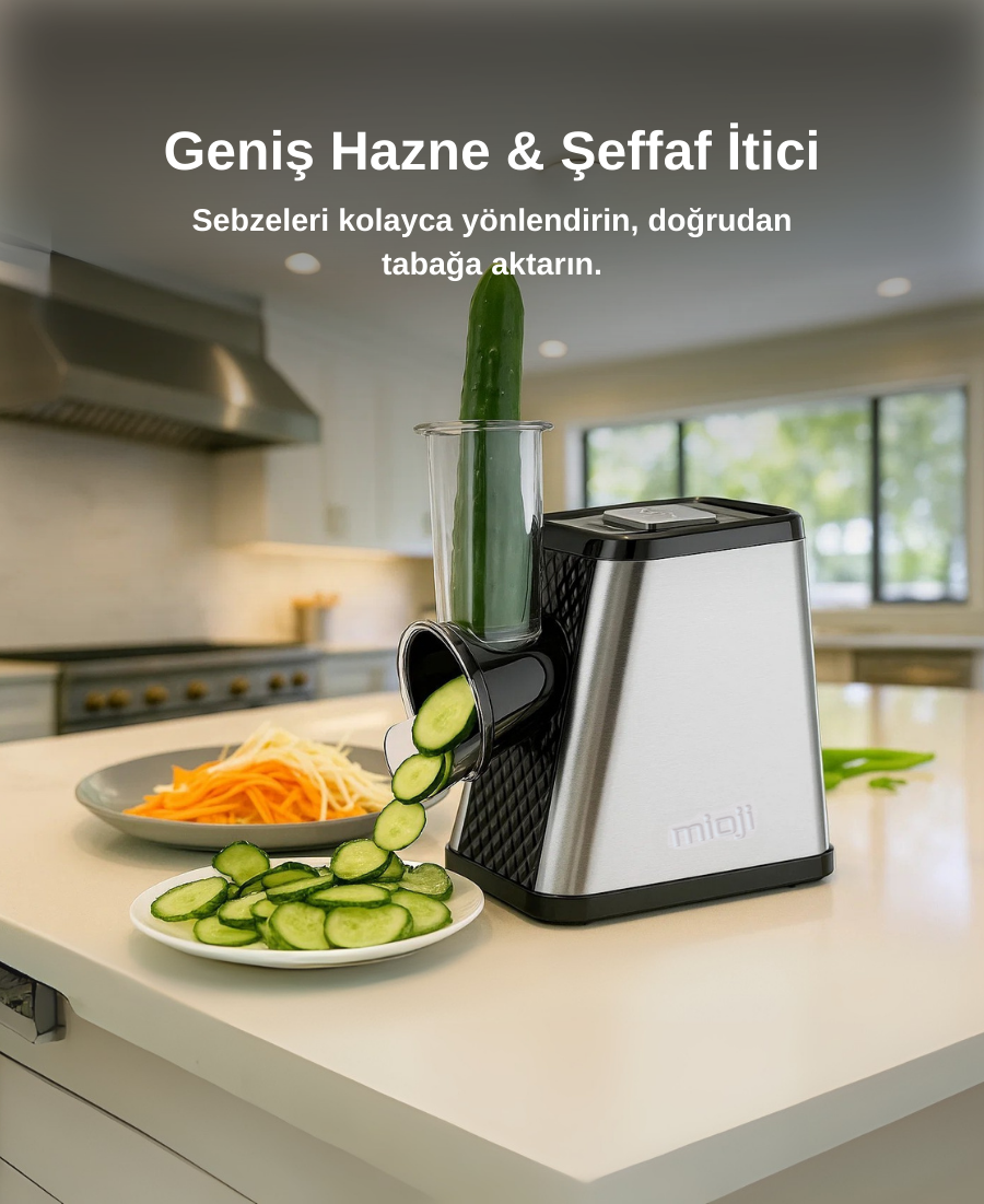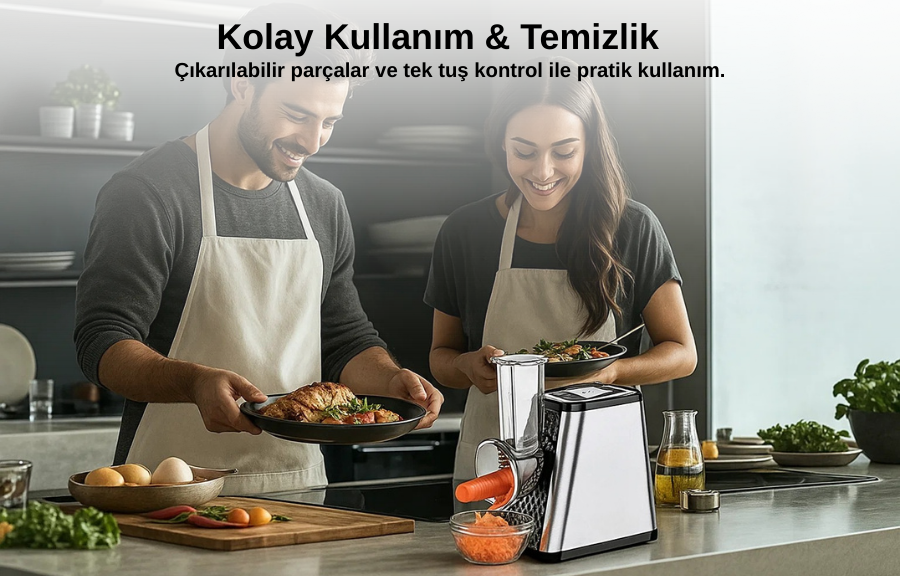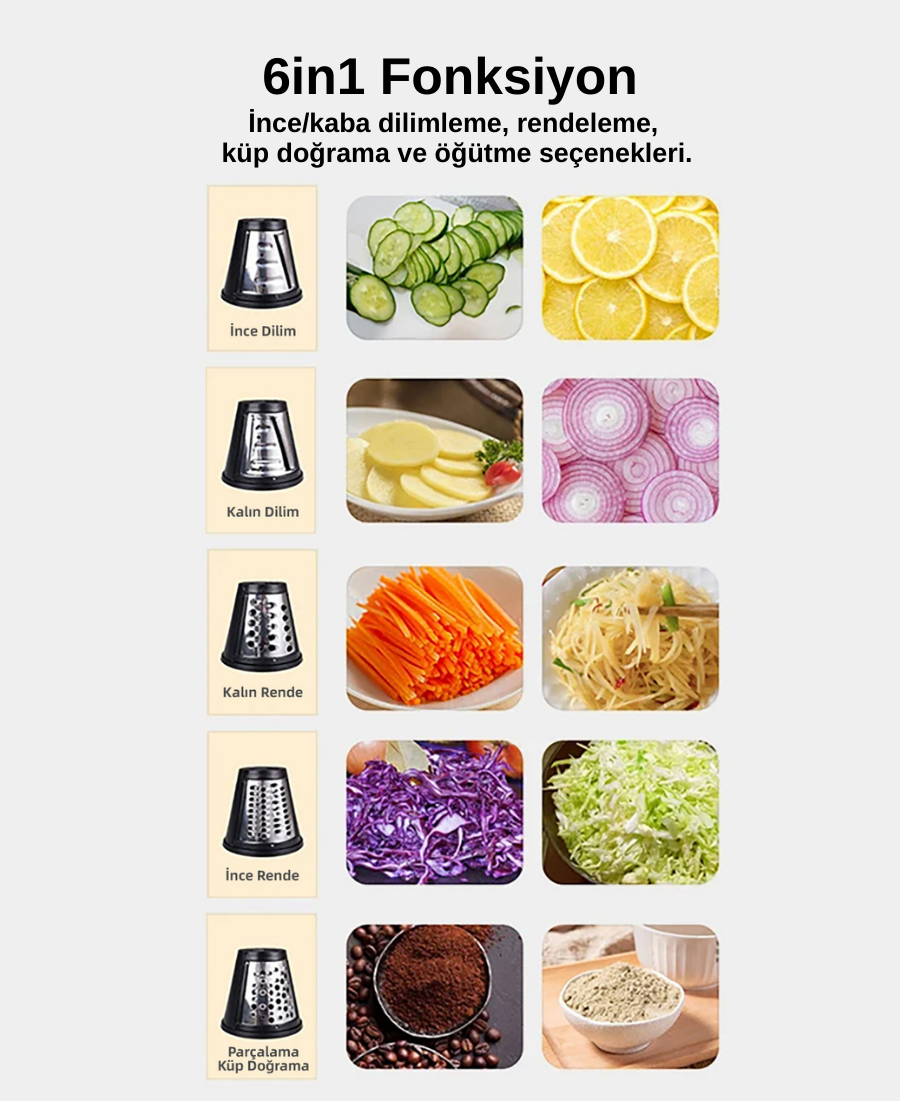 Şef Gibi Hazırlık, Pratik Sunum! 6 farklı bıçak aparatıyla mutfağınızdaki tüm doğrama, dilimleme ve rendeleme işlerini saniyeler içinde halleder.
