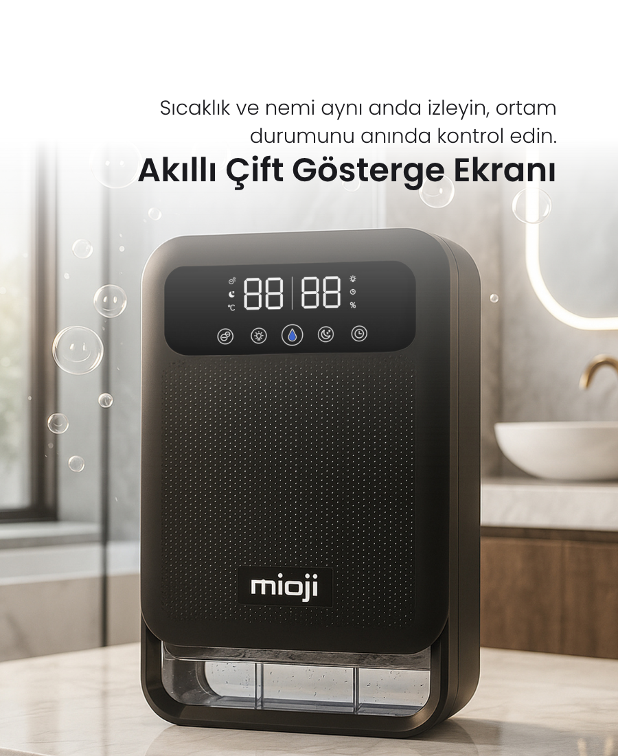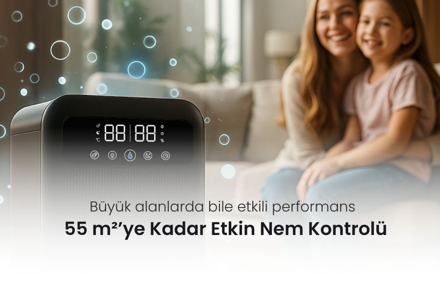 Akıllı Konfor: Sessiz, Etkili ve Şık Nem Alma 55 m²’ye kadar olan alanlarda aktif nem kontrolü sağlayarak ortamınızı hem daha sağlıklı hem de daha konforlu hâle getirir.