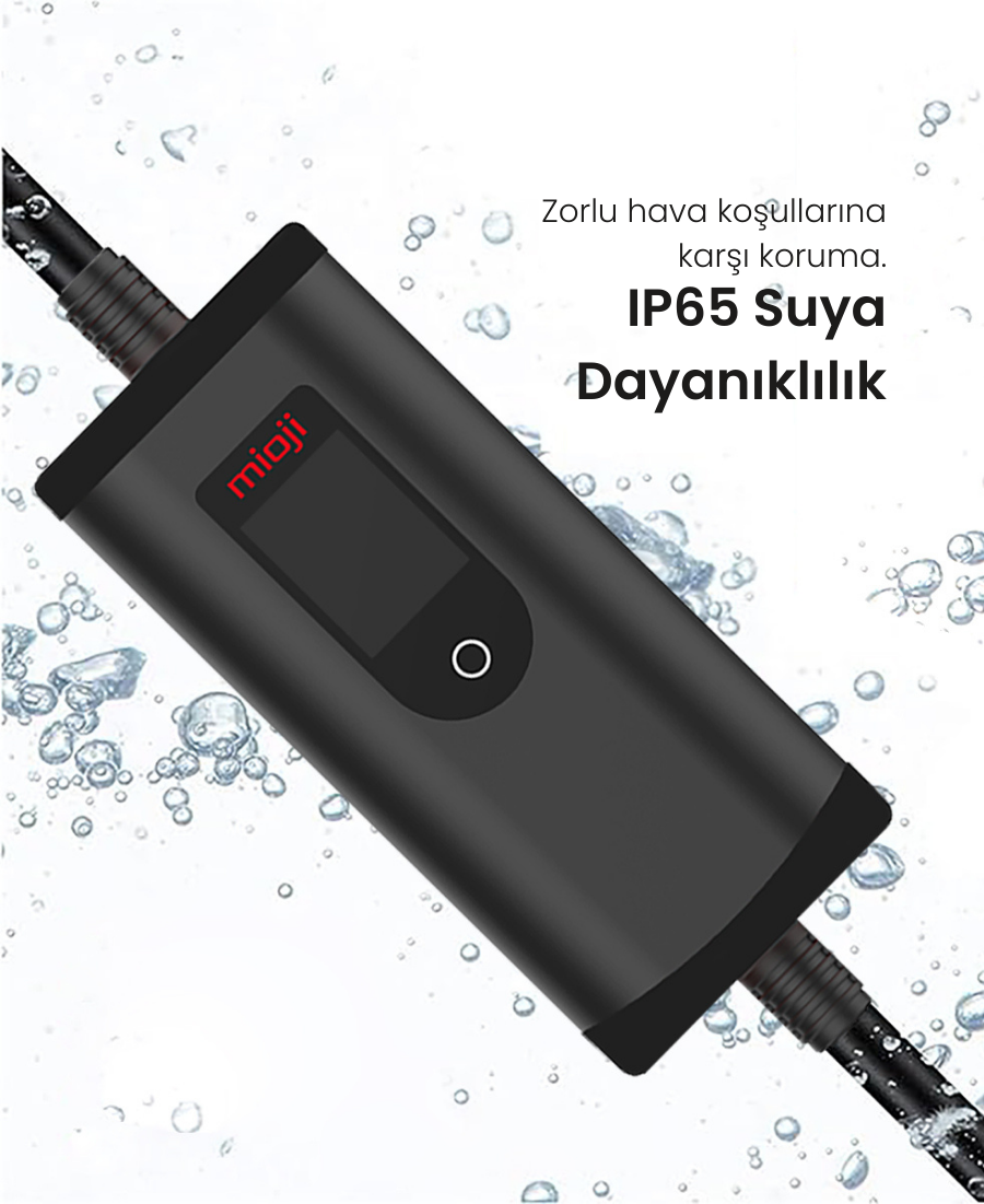 Mioji MIO FC22, IP65 koruma seviyesiyle toza ve yağmura karşı yüksek dayanıklılık sunar. Böylece dış mekânda da elektrikli aracınızı gönül rahatlığıyla şarj edebilirsiniz. (Not: Şarj fişi su geçirmez değildir, bu nedenle su geçirme koruması gereklidir.)