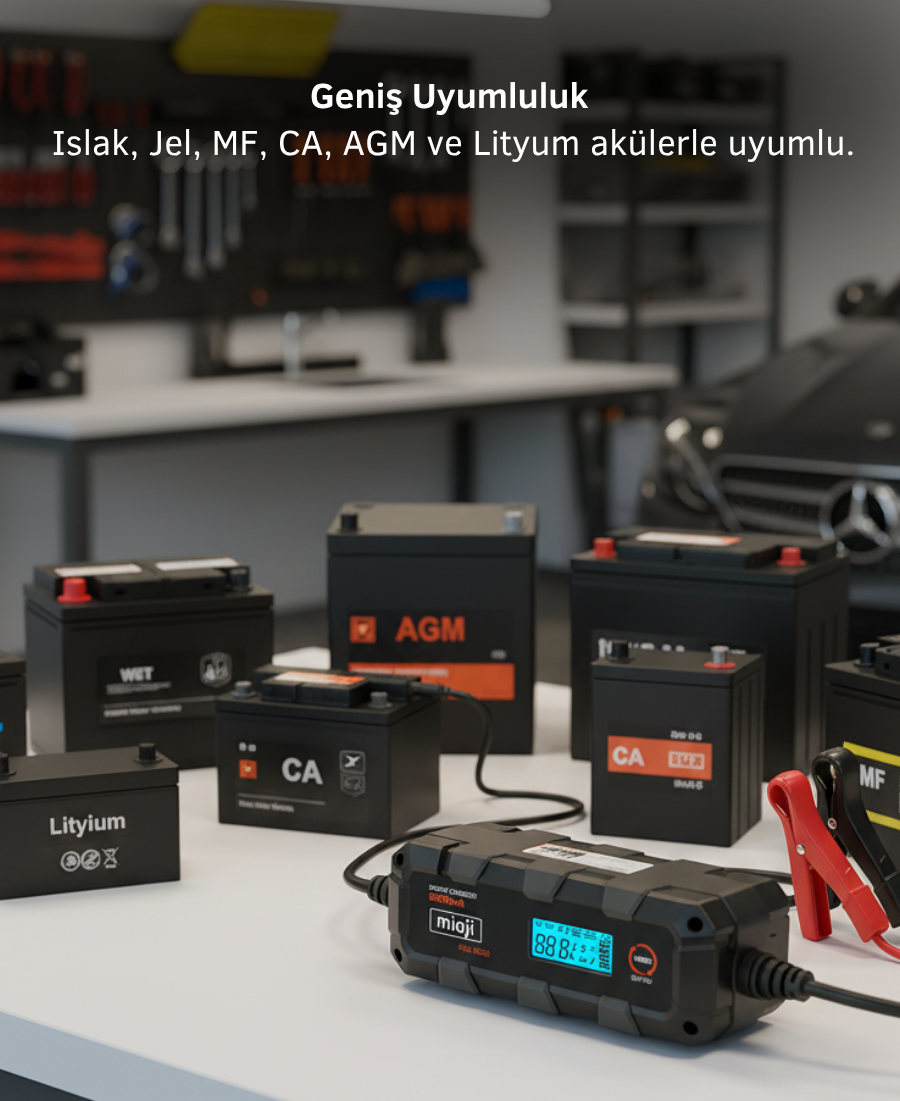 | Uyumluluk | Islak, Jel, MF, CA, AGM ve Lityum akülerle uyumlu |