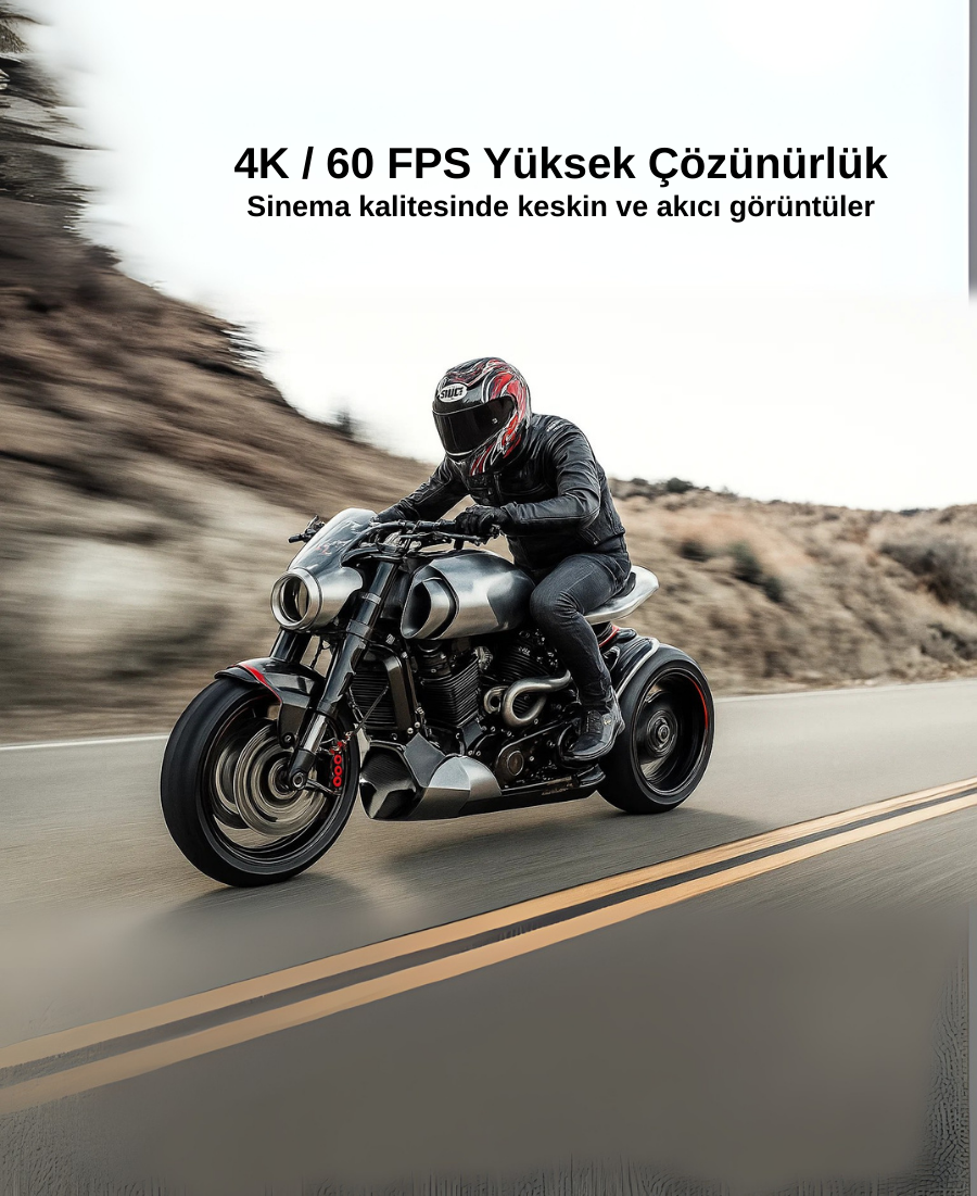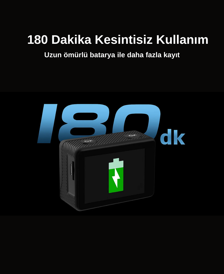 Yerleşik yüksek kapasiteli batarya ile tek şarjda 180 dakikaya kadar kesintisiz video çekimi sunar. Uzun yolculuklar ve maceralar için ideal.