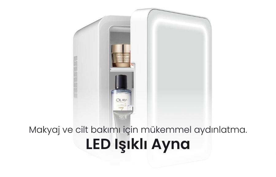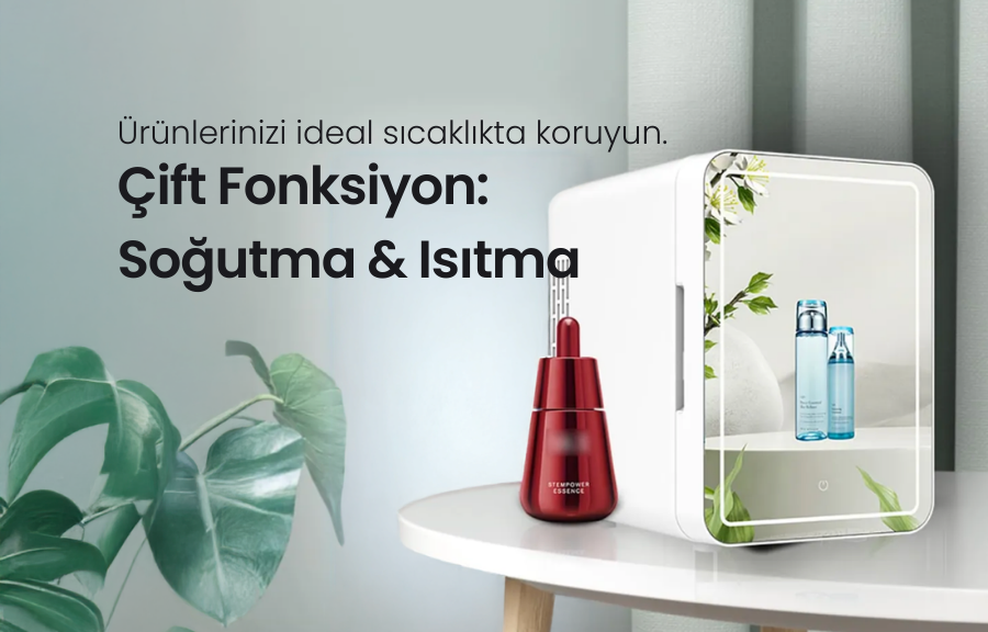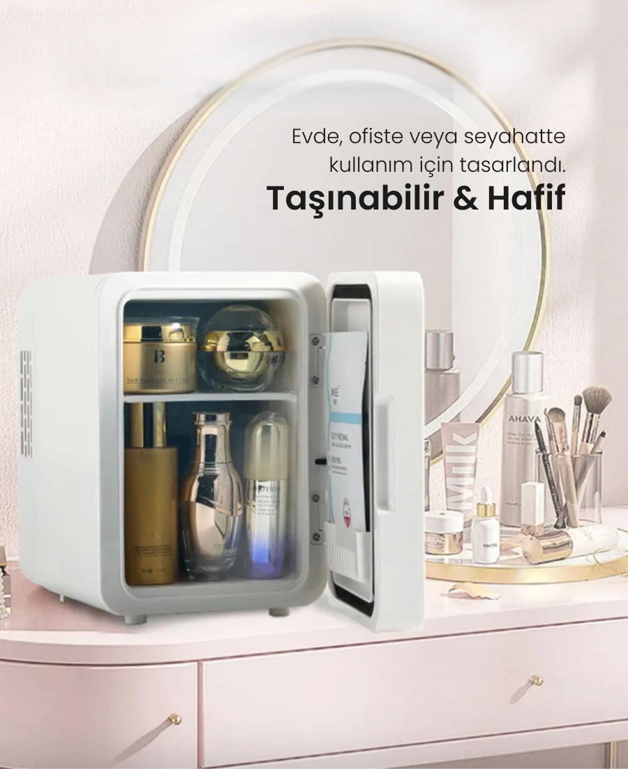 Kozmetik Ürünleriniz İçin Mükemmel Sıcaklık, Her Yerde! 4 litrelik kapasitesi, LED ışıklı ayna tasarımı ve çift fonksiyonlu soğutma-ısıtma özelliğiyle kozmetik ürünlerinizi her yerde güvenle saklamanızı sağlayan taşınabilir bir mini buzdolabıdır.